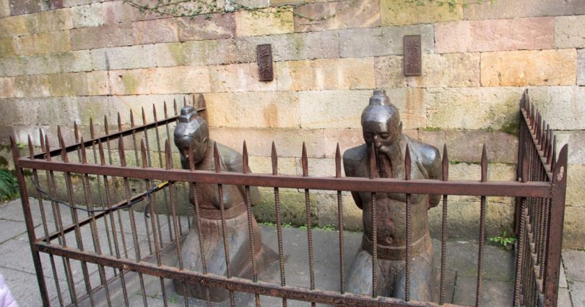 В самом сердце китайского города Ханчжоу, прямо напротив величественного мавзолея генерала, которого они предали, стоят статуи Цинь Хуэя и его жены. На коленях, с опущенными головами и связанными за спиной руками, они навсегда обречены на унижение.