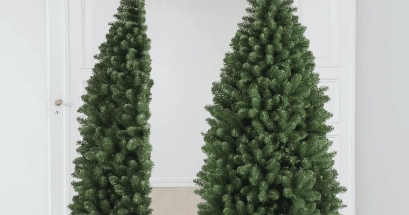 Выглядит как стандартная ель, разрезанная вертикально пополам. У нее плоская задняя часть, что позволяет установить ее вплотную к стене.