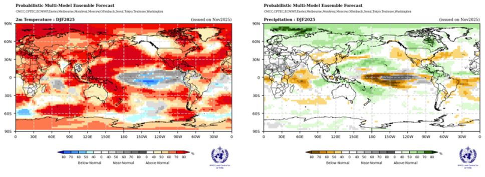 По информации Всемирной метеорологической организации (ВМО), многомодельный комплексный прогноз на зиму 2025–2026 годов указывает на сильный глобальный сигнал о повышении вероятности температур поверхности суши, превышающих норму, с высокой степенью соответствия модели на большей части Северного полушария выше 30° северной широты. Южные и северо-восточные регионы Северной Америки, Центральная Америка, Карибский бассейн и Северный полярный круг – все они демонстрируют повышенную вероятность условий, превышающих норму, что подтверждается надежной согласованностью модели. В Южном полушарии повышенная вероятность температур выше нормы прогнозируется над Новой Зеландией и южными регионами Южной Америки, в то время как на большей части территории Австралии наблюдается слабое повышение вероятности температур выше нормы.