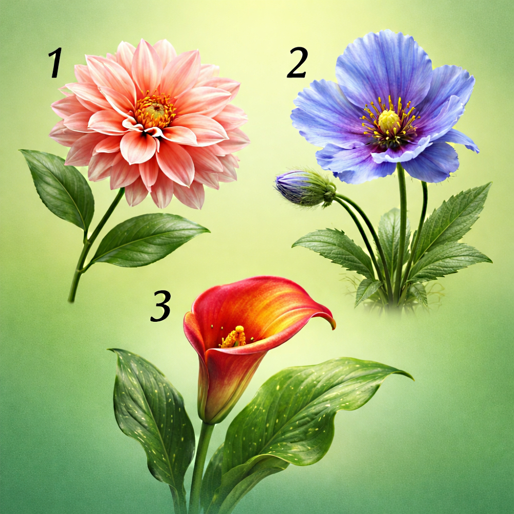 Перед вами три разных цветка. Каждый из них несёт своё предсказание. Посмотрите на картинку и выберите тот, который первым привлёк ваше внимание. Не анализируйте — первый выбор самый верный.