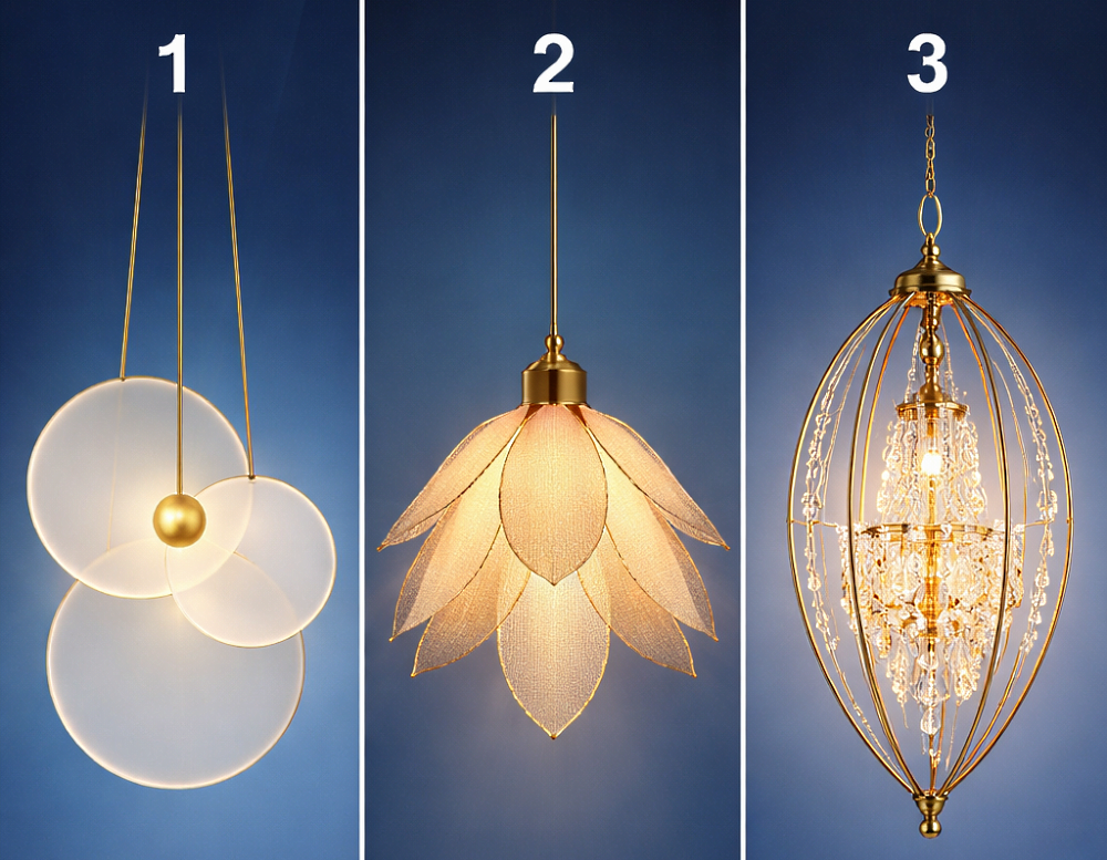 Перед вами картинка с тремя светильниками. Все они красивые, но абсолютно разные по форме и стилю. Ваша задача — выбрать тот светильник, который привлекает вас больше всего.