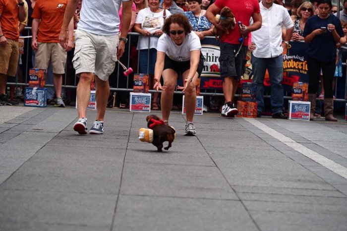 Спортивное мероприятие называется 2013 Running of the Wieners, что можно перевести как "Забег венских сосисок 2013", в котором принимают участие собаки определённых пород, имеющие продолговато-вытянутое туловище. Взглянув на фотографии, вы поймёте почему именно: одним из обязательных условий участия в соревновании является наличие костюма в виде булочки для хот-дога. делающими собачек похожими на самый популярный американский фаст-фуд. Некоторые мероприятие так и называют – гонки хот-догов.