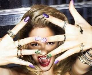 Еще одна любительница спецэффектов - певица Кеша. Ее выбор - пастельные оттенки в сочетании с золотым френчем и пирсингом в ногтях. Такой намеренный китч девушка доводит до апогея с помощью крупных золотых украшений.