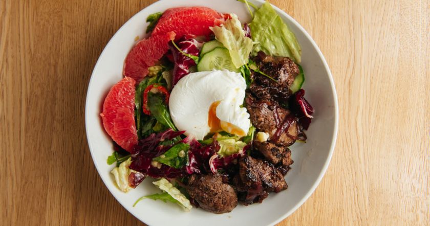 Если нет времени на приготовление ужина, то можно подать к столу теплый салат с куриной печенью и яйцом-пашот. Полчаса времени – и блюдо готово к подаче на стол. Салат получается легким, но при этом сытным.