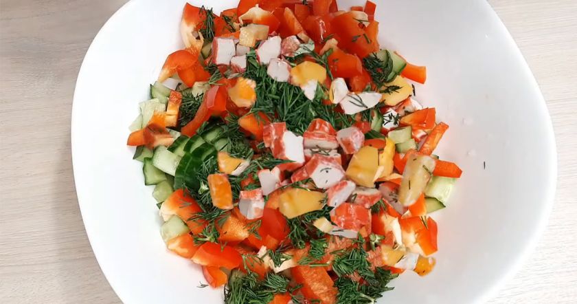 Как приготовить салат "Радуга" с крабовыми палочками и хурмой
