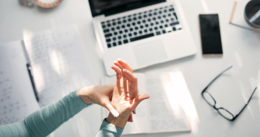 Главное — дать движение кисти, пальцам. Делать регулярные перерывы каждые 45 мин. Как минимум — это круговые движения кулаком. Чем больше нагрузки и разнообразия, тем лучше. В идеале можно приобрести подставку для локтя. Она представляет собой кружок, на котором должна находиться мышка. От круга идет опора к локтю (она крепится к столу и помогает снять нагрузку с кисти).