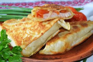 Треугольники из лаваша с сыром и помидорами на сковороде