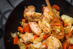 Индейка с луком и морковью на сковороде