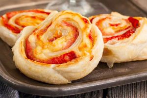 Рулетики из слоеного теста с колбасой и сыром