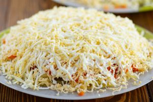 Слоеный салат с шампиньонами и жареной колбасой