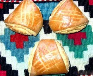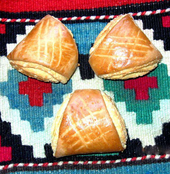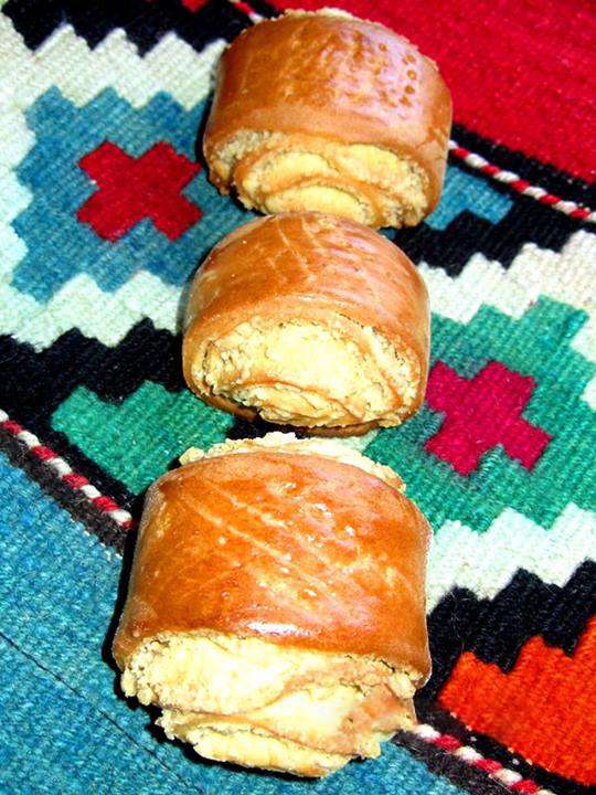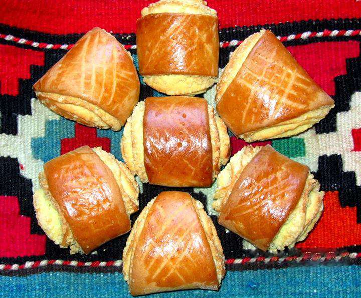 Խմորը բաժանել 2 մասի: Յուրաքանչյուրը գրտնակել, տարածել միջուկը, փաթաթել, բաժանել մասերի: Կտորների վրա հարած ձու քսել և թխել նախապես 180 (350F) աստիճան միացրած ջեռոցում մոտ 30 րոպե կամ մինչև կարմրելը: Բարի ախորժակ!!!! Հարգանքներով՝ Նինա Մինասյան