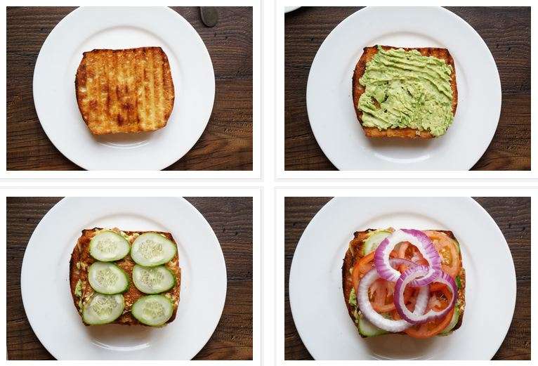Քսում ենք քերած և փափկեցրած ավոկադոն և այնուհետ հերթականությամբ շարում մյուս մթերքները