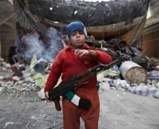 32 Մարտի 27, 2013թ.: Հալեպի Սալահադին թաղամասում Սիրիայի ազատ բանակի ռազմիկի 7-ամյա որդի Ահմեդը, կանգնած բարիկադների առջև, օգնում է Սիրիայի ազատ բանակի մարտիկներին: