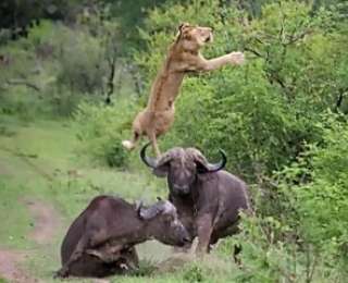 52-ամյա Յան Մաթեսոնը և իր տղան` 16-ամյա Օլիվերը, առավոտ կանուխ մեքենայով անցնելիս են եղել Կրուգեր զբոսայգով, երբ նրանք նկատել են, թե ինչպես են առյուծները Մջեջենի արգելոցի ու Հարավային Աֆրիկայի Կրուգերի ազգային զբոսայգու սահմանին հետապնդել գոմեշին: Նրանք 45 րոպե շարունակ հետևել են կենդանիներին, մինչև որ առյուծներից մեկը վերջապես գետնին է տապալել գոմեշին, սակայն չի հասցրել վայելել իր որսը, քանի որ հայտնվել է նրա ընկերն ու առյուծին կոտոշներով օդ թռցրել: