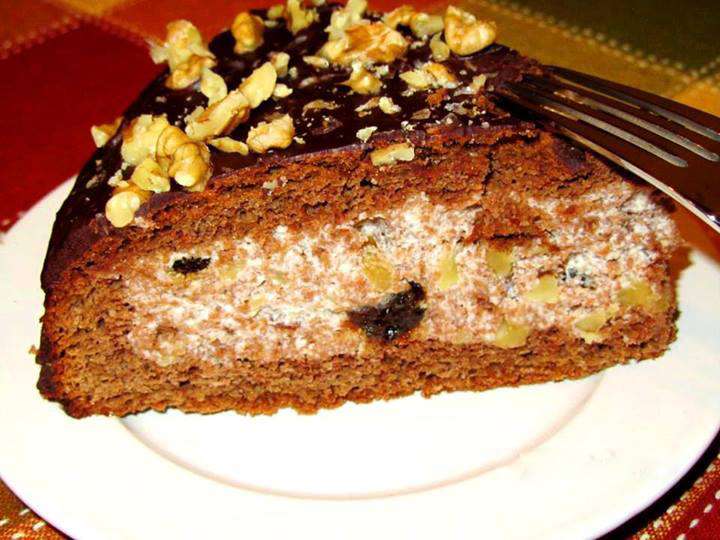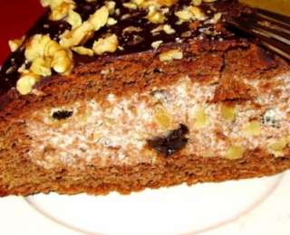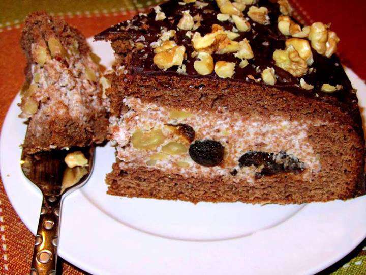 400 գ յուղոտ ու թանձր թթվասերը կես բաժակ շաքարի փոշու հետ լավ հարել, ավելացնել վանիլ, 1 բաժակ կտրատած ընկույզ, 200 գ սև սալորաչիր` նախապես լվացած ու կտրատած: 1 ճ. գդալ ժելատինը 1/3 բաժակ ջրի մեջ թողնել, որ ուռչի, հետո դնել կրակին ու անընդհատ խառնել, մինչև ժելատինը լուծվի, անհրաժեշտության դեպքում քամել մանր ցանցով: Թողնել սառչի: Թթվասերով զանգվածին ավելացնել խմորի միջուկը, ժելատինը, խառնել, ստացված յուրահատուկ կրեմով լցնել մեր արկղիկը և ծածկել կտրած շերտով` մի փոքր սեղմելով: