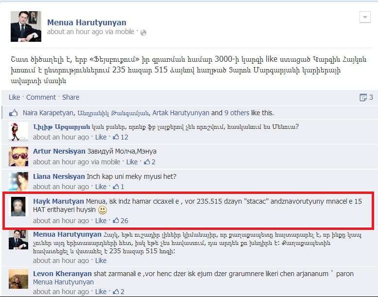 Երևի այս ստատուսը գրելիս Մենուան չէր սպասում, որ անգամ իր էջում իր «ընկերները» կպաշտպանեն Հայկոյին :)