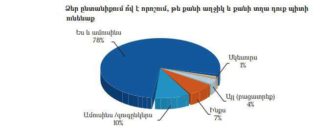 Այն հարցին, թե ով է իրենց ընտանիքում որոշում, թե քանի տղա և քանի աղջիկ պետք է ունենաք, քանակական հարցման մասնակիցների ճնշող մեծամասնությունը պատասխանել է, որ որոշումը կայացնում են ամուսիններով` միասնաբար (77.8%): Կանանց միայն 6.6 տոկոսն է ինքնուրույն որոշում, թե ինչ սեռի երեխա պետք է ունենա, իսկ ընտանիքների 10.6%-ում որոշումը կայացվում է բացառապես ամուսնու կողմից: Ինքնուրույն որոշում կայացնող կանանց մոտ կեսը ամուսնացած է (40.2%) կամ ապրում են համատեղ (4.7%):