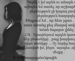 Հ.Գ. Երազներում արդեն կառուցում էինք մեր ընտանիքը, բայց խարխուլ էր իմ ու քո սիրո տանիքը... Ու նորից հարցն է նույն ՝ Աստված իմ, ինչո՞ւ այսպես, սիրե՞լն էր իմ մեղքը: