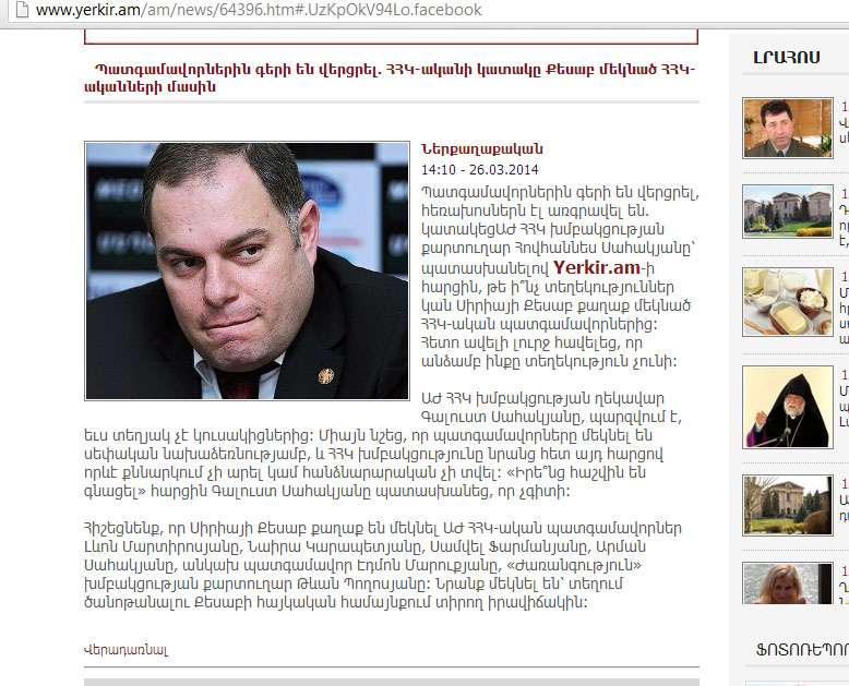 Չեմ դադարում զարմանալ մեր քաղաքական որոշ գործիչների անմակարդակության, մտքի տկարության, ցինիզմի ու որոշ լրատվամիջոցների «ռեյթինգացավի» վրա: Այս ամենի սիմբիոզն այնքան զզվելի է, որ զայրույթդ չես կարողանում զսպել: Օրերս Թուրքիայի սահմանին մոտ գտնվող Քեսաբ քաղաքի վրա իսլամիստ ահաբեկիչներ հարձակվեցին ու կոտորեցին տեղի շատ հայերի, մյուսներին էլ ստիպեցին տարհանվել: Սարսափելի էին այն կադրերը, որտեղ ահաբեկիչները սպանում էին խաղաղ բնակիչներին: Արյուն, ցավ ու հուսահատություն... Հուսահատվեցինք նաև մենք՝ հեռվից այս ամենը դիտողներս, այն փաստից, որ մեր պետությունը ոչինչ չի անում այս դեպքերը կանխելու համար: Բարեբախտաբար, շտապել էինք մեր եզրակացություններում ու այսօր իմացանք, որ մարդկային բարձր հատկանիշներով օժտված 6 քաջ հայ պատգամավորներ Լևոն Մարտիրոսյանը, Նաիրա Կարապետյանը, Սամվել Ֆարմանյանը, Արման Սահակյանը, անկախ պատգամավոր Էդմոն Մարուքյանը, Թևան Պողոսյանը մեկնել են Քեսաբ, որպեսզի տեղում ծանոթանան իրավիճակին, հասկանան, թե ինչով կարելի է օգնել այնտեղի հայությանը և ի վերջո ցույց տան, որ հայոց պետությունը անտարբեր չէ սիրիահայության հանդեպ... Ու այս դրամատիկ պահին, երբ ողջ ազգը սպասում է մեր «Նոյի աղունիկներին», գտնվում է մի բութ հումորիստ ՀՀԿ-ական՝ Հովհաննես Սահակյան անունով, ով պատեհ է համարում կատակի վերածել իր կոլեգաների այցը Քեսաբ, և հայտարարում է, որ «Պատգամավորներին գերի են վերցրել, հեռախոսներն էլ առգրավել են»: Առնվազն զարմանալի է, թե ինչպես է եղեռն տեսած ժողովրդի զավակի լեզուն պտտվում հումոր անել այն պահին, երբ Սիրիայում նոր եղեռնի ականատեսն ենք դառնում: Տարօրինակ է նաև, թե ինչպես է նա համարձակվում նման տոնով մեկնաբանել իր կոլեգաների՝ իսկապես վտանգավոր այցը, երբ ինքը անձամբ վախից կուչ է եկել, ու երբեք չէր համարձակվի դեպքերի զարգացման կենտրոն մեկնել: Քեսաբում մարդիկ են զոհվում, անօթևան դառնում, իսկ մենք ու այդ հերոս պատգամավորների ընտանիքները լարված լուրի ենք սպասում ու արդյունքում ստանում ենք քո տհաճ կատակը, Հովհաննե՛ս Սահակյան: