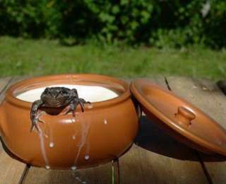 Երկու գորտ որոշում են աշխարհ տեսնել: Դուրս են գալիս իրենց ջրափոսից ու ցատկոտելով գնում: Գնում են, գնում, հասնում մի գյուղացու տան բակ: Թռչկոտելով առաջանալիս ընկնում են կաթով լի դույլի մեջ: Կաթը գորտի համար անսովոր հեղուկ է, սկսում են խեղդվել, չեն կարողանում լող տալ ու դուրս գալ: Շուտով գորտերից մեկը հուսահատվում է, թուլացնում թաթերը, սուզվում դույլի հատակն ու խեղդվում: Մյուս գորտը համառորեն թափահարում է իրեն, փորձում մնալ կաթի երեսին: Արդյունքում կաթը հարվում է ու երեսին կարագի գնդիկ է հայտնվում, գորտը բարձրանում է դրա վրա ու դուրս թռչում դույլից: