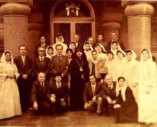 (Լուսանկար.՝ Լուսինե Զաքարյանը Լենինականի Ս. Աստվածածին եկեղեցու երգչախմբի հետ՝ Մայր Աթոռ Ս. Էջմիածնում՝ պատարագից հետո: 1984թ.)