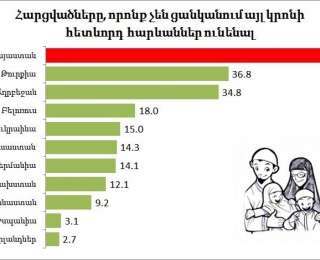 Հետաքրքիր տվյալներ գտա World Value survey-ում: Կրոնական հանդուրժողականության ցուցանիշ է հանդիսանում այլ կրոնի ներկայացուցչի հարևան լիելու նկատմամբ դիրքրորոշումը: Հայերի մեծամասնությունը (57%) չի ցանկանում այլ կրոն դավանող հարևան ունենալ: Այստեղ անհրաժեշտ է հասկանալ սոցիալ-պատմական ենթատեքստը, քանի որ առանց դրա հնարավոր է գալ սխալ եզրակացության: Հայերը ոչ թե «անհանդուրժող» են այլ կրոնական խմբերի նկատմամբ, այլ պատմական հիշողության մեջ առկա է արխետիպ, որ այլակրոնությունը ներկայացնում է սեփական էթնիկ խմբի գոյության առաջնային վտանգ: Մյուս կողմից էլ «այլակրոնությունը» առաջին հերթին նույնականացվում է իսլամի հետ: Հետաքրքրական է, որ Թուրքիայում և Ադրբեջանում կրոնական անհանդուրժողականությունը բավականին բարձր է չնայած հասարակությունների «մոդեռնիզացմանը և եվրոպականացմանը»: Հատկանշական է նաև, որ եվրոպական երկրներում կրոնական անհանդուրժողականության մակարդակը համեմատաբար բարձր է Գերմանիայում, որտեղ բնակվում են ավելի քան 4 մլն թուրք: Այնինչ ՄՄ-երկների մեջ հանդուրժողականը մահմեդական բնակչություն ունեցող Ղազախստանն է (12.1%):