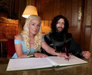 Բրիտանական Հերֆորդ քաղաքի բնակիչներ Դարեն Պրյուն և Քերրի Ֆորդը որոշեցին տարբերվել բոլորից և իրենց հարսանիքը կազմակերպել, երևի թե, ամենաանհավանական սցենարով՝ «Գահերի խաղը» հանրահայտ հեռուսասերիալի նմանողությամբ: Պրոֆեսիոնալ դիմահարդարների և հագուստի դիզայներների օգնությամբ նրանք վերամարմնավորվեցին սերիալի կերպարների պես: Հարսանեկան արարողությունը անցել է 19-րդ դարի ամրոցում, որին մասնակցում էին անգամ իրական կիսագայլեր և սպիտակ ձիեր: Միայն տորթի ստեղծման համար դիզայները ծախսել է 5 շաբաթ: Տորթի ամեն մի շերտը ներկայացնում էր սերիալի թագավորություններից մեկը: Այս հարսանիքին ամեն ինչ գրեթե նույնական էր «Գահերի խաղին», սակայն մի տարբերությամբ. սերիալը հայտնի է իր արյունառատ հարսանիքներով, իսկ այս մեկը, բարեբախտաբար, անցել է առանց դրա: