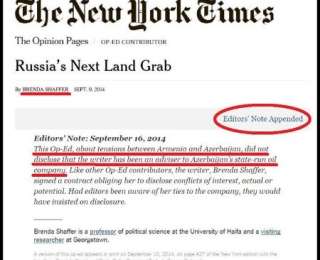 New York Times թերթը սեպտեմբերի 16-ին խմբագրական նկատառում է հավելել ամերիկացի հայտնի քաղաքագետ Բրենդա Շաֆերի՝ սեպտեմբերի 9-ին պարբերականում հրապարակած հոդվածին։ Պարբերականը հրապարակավ նշել է, որ Շաֆերը Ադրբեջանի պետական նավթային ընկերության հետ իր կապը չի բացահայտել, ինչը պահանջվում է New York Times-ի կանոններով։