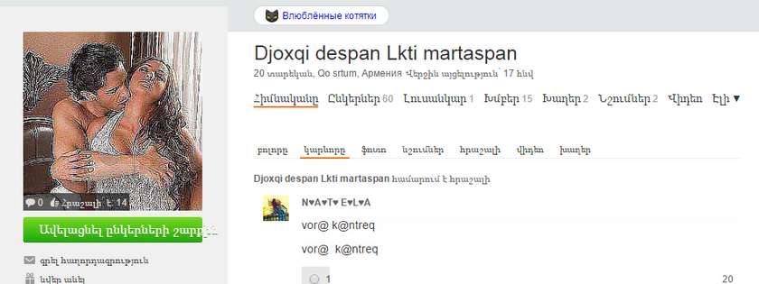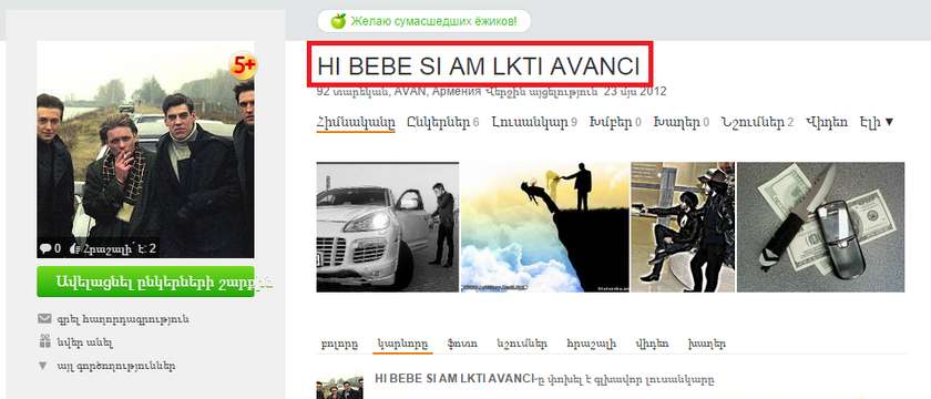 Օրինակ՝ ի՞նչ եք կարծում, ի՞նչ բովանդակությամբ կոնտենտ կարող են իրենց պատերին տարածել այնպիսի փառահեղ օդնոկլասսնիկյան կերպարներ, ինչպիսիք են. «Կրքոտ կարիճը», «Դժոխքի դեսպան Լկտի մարՏասպանը» ու անգլերենի լեզվաբան, նոր Աճառյան «Hi bebe si am ltki avanci (ըստ երևույթին՝ Hi baby I аm lkti Avatntsi)»-ն։