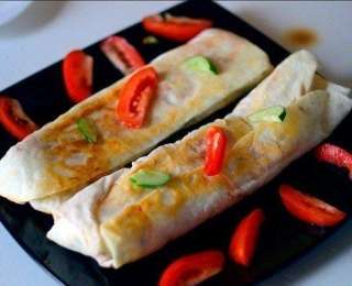 9. Լավաշի վրա քսել երկու տեսակի սոուսները: Լավաշի վրա լցնել հավը, կողքին դնել կաղամբը, լոլիկը, վարունգը: Փաթաթել ծրարաձև, և պատրաստ է: