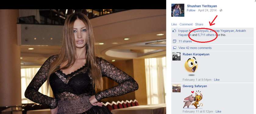 Շուշանին վստահորեն կարելի է համարել ֆեյսբուքում ամենաշատ լայքվող աղջիկ: Ինչ լուսանկար էլ որ տեղադրի, ինչ գրառում էլ որ անի, ընդամենը րոպեներ անց լայքերի թիվը անցնում է հարյուրները, և էլ չեմ ասում քոմենթների թիվը ... և, ինչու ոչ, նաև բովանդակությունը: Դե Շուշանն էլ օգտվում է իր այս «հայտնիությունից» ու օրը գոնե 1-2 լուսանկարով ուրախացնում իր երկրպագուներին: