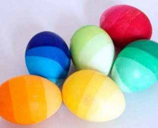 Սկզբում ձվերը ներկեք բաց երանգների գույներով, հետո ներկված ձուն թաթախեք ավելի մուգ երանգի գույնի մեջ՝ նախօրոք դրան խառնելով 1 թեյի գդալ ձեթ: Արդյունքը շատ գեղեցիկ է`