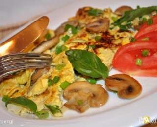 5. Սպիտակուցն ու դեղնուցը խառնել իրար, ավելացնել կաթը, աղ անել և խառնել: Այս զանգվածը լցնել սնկի և սոխի վրա:
