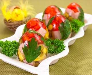 Հավի արգանակ եփել, սառեցնել, ժելատինը թրջել նրա մեջ: Մեկ-երկու ժամից ժելատինը դնել կրակին, տաքացնել առանց եռացնելու: Խառնել, մինչև ժելատինը լրիվ լուծվի: Ձվերը լավ լվանալ, չորացնել: Ձվի տափակ ծայրից կտրել, դատարկել, լավ լվանալ: Չորացնելուց հետո կճեպները պատրաստ են: Ապուխտը, պղպեղը կտրատել: Ոլոռը կամ եգիպտացորենը քամել: Կճեպի մեջ դնել կանաչու տերևներ, հերթով լցնել ապուխտը, եգիպտացորենը, պղպեղը, եթե կա՝ տարբեր գույների: Երբ կճեպը լցվի, բաղադրիչների վրա լցնել ժելատինը: Դնել սառնարանի մեջ: Մատուցելուց առաջ կճեպը հեռացնել: