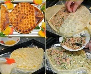 Լցնել խմորի վրա բրինձը ձվի հետ, վերևը դնել պատարաքաղով պյուրե սարքած ձուկը: Մնացած խմորից կտրել պոչը և գլուխը, իսկ մնացած խմորը կտրել շրջանակներով բաժակի օգնությամբ: