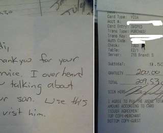 Ամերիկացին նստած էր սրճարաններից մեկում, ուտում էր ու լսում, թե ինչպես է մատուցողուհին գանգատվում, թե չի կարողանում տեսնել սիրելի որդուն, որովհետև փող չունի նրա մոտ գնալու համար... Երբ հաճախորդը հեռացավ, մատուցողուհին հայտնաբերեց նրա թողած գրությունը՝ «Շնորհակալություն, Բրենդի, սպասարկելու համար... Պատահաբար լսեցի քո խոսակցությունը տղայիդ մասին: Օգտագործիր այս փողը նրան տեսնելու համար»... Ու թողել էր 209 դոլար 53 սենթ... 9 դոլար 53 սենթը ճաշի արժեքն էր...