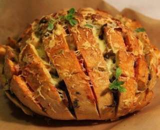 4. Հացը կտրել սկզբում խաչաձև, այնուհետև երկայնքով, բայց ոչ մինչև վերջ: Այնպես, որ ստացվի վանդակ խորանարդներով մոտ 2х2 սմ: