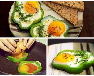 Պղպեղները լվանալ, հորիզոնական կիսել, մաքրել։ Տապակի մեջ կարագ լցնել, պղպեղները մի փոքր տապակել 2 կողմից: Յուրաքանչյուրի մեջ 1-ական ձու կոտրել, աղ, պղպեղ լցնել, վերջում մաղադանոս: