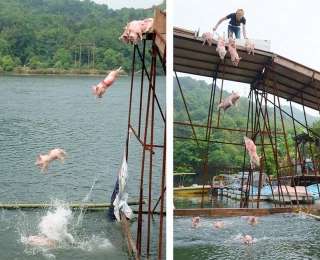 Չինաստանն ինչպես միշտ զարմացնում է հնարամտությամբ: Մրցույթին մասնակցում են միայն դիմացկուն խոզուկները: Բարձրությունից նետվելով ջրի մեջ՝ մրցույթը սահուն կերպով անցնում է լողալուն:
