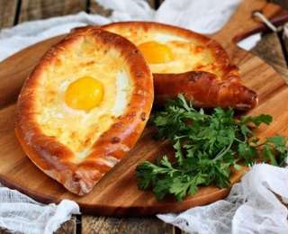 Ստացված «նավակի» մեջ լցնել պանրի 1/5-րդ մասը և տեղափոխել ջեռոց՝ եփվելու 10 րոպե 200 աստիճանում մինչև խմորի ոսկեգույն դառնալը: Այնուհետև հանել խաչապուրին ջեռոցից, դանակով փոս անել պանիրի մեջտեղում, վրան կոտրել 1 հատ ձու և տեղափոխել ջեռոց ևս 5 րոպեով: