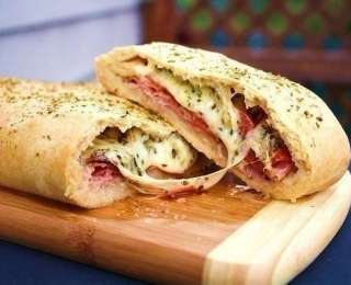 Խմորն ուղղանկյունաձև բացել, վրան քսել տոմատի մածուկը՝ կողքերից թողնելով ազատ տարածություն (ինչպես ցույց է տրված նկարում): Վրան շաղ տալ քերած պանիրը, շարել խոզապուխտի և սալյամիի շերտերը: Ձուն կոտրել փոքրիկ ամանի մեջ, հարել, ապա քսել խմորի կողքերի ազատ հատվածների վրա: Խմորը փաթաթել ռուլետի նման, վրան հարված ձու քսել, շաղ տալ մի քիչ քերած պանիր, չորացրած կանաչի: Ռուլետի վրա դանակով կատարել փոքրիկ կտրվածքներ 4-5 սմ հեռավորության վրա: