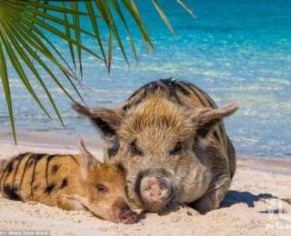 Խոզերը վազվզում են ափի երկայնքով, արևայրուկ են ստանում և լողում են տաք փիրուզագույն ջրում՝զբոսանավերում գտնվող զբոսաշրջիկներին ողջունելու համար։