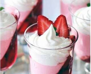 • Լցնել բաժակների մեջ, թեքությամբ դնել մաֆինի ամանների մեջ, ելակները կտրատել, լցնել ժելեի մեջ: