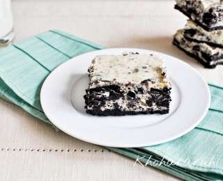 2. Թխվածքի հիմքը պատրաստելու համար 28 հատ Oreo թխվածքաբլիթները բլենդերով լավ մանրացնել, ավելացնել հալած կարագը և լավ խառնել: Ստացված զանգվածը լցնել թավայի մեջ, ձեռքերով սեղմելով հարթեցնել: 10 րոպե ջեռոցում թխել և թողնել, որ սառի: Վերցնել 20 հատ թխվածքաբլիթ և դարձյալ մանրացնել (ոչ շատ մանր):