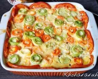 Դդմիկի և գազարի բոլոր շերտերը ռուլետանման փաթաթել և շարել ջեռոցի թավայի մեջ: Լոլիկի կտորները եզրերով շարել:
