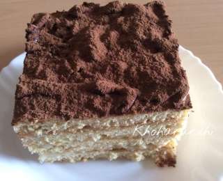Թխվածքի շերտերը միացել կրեմով: Շոկոլադե սալիկը միկոալիքային վառարանում հալեցնել և տարածել թխվածքի վրա: Վերջում ավելացմել կակաոն: 2 ժան թողնել, ապա կտրել և մատուցել:
