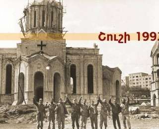 Շուշին ազատագրումից հետո, 1992թ.։ Կենտրոնում Արկադի Տեր-Թադևոսյանն է։