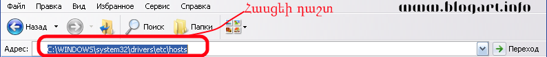 Վիրուսը, համակարգչի մեջ ընկնելուց, առաջինը շատ մեծ արագությամբ արգելափակում է հակավիրուսի թարմացման սերվերների հասցեները, որ հակավիրուսը չհասցնի արգելափակել այն: Այսինքն` մտնում է C:WINDOWSsystem32driversetc հասցեում գտնվող hosts ֆայլի մեջ: Մտեք Мой компьютер և հասցեի դաշտում (նկ.1) գրեք C:WINDOWSsystem32driversetchosts հասցեն, սեղմեք Enter կոճակը ու բացվածում (նկ.2) նշեք Блокнот(Notepad) և սեղմեք OK կոճակը: