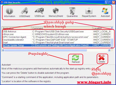 Տվյալ անհաճելի դեպքերից խուսափելու համար կա մի ծրագիր` USB Disk Security, որը նախքան autorun.exe և autorun.inf ֆայլերի գործելը ստուգում է արտաքին սարքը և եթե գտնի վիուսներ տեղյակ կպահի և դուք կջնջեք դրանք, իսկ եթե չգտնի ապա ուղակի կբացվի և ցանքում ոչինչ չի ցույց տա, այսինքն՝ արտաքին սարքում չկա վիրուսներ և կարելի է հանգիստ օգտագործել: Տվյալ դեպքերի գործողությունները բացատրված են ներքևի նկարներում: