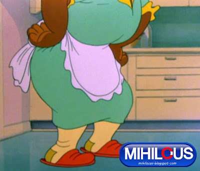 Նախ ասեմ, որ աաայ այդ կնոջն անվանում են Mammy two shoes :))) Կերպարը վերցված է սովորական սևամորթ տնային տնտեսուհու կերպարից: Մուլտֆիլմի սկզբում նա հանդես էր գալիս իբրև հավաքարար, ով հետևում էր այն տան մաքրությանը, որտեղ ապրում էին Թոմն ու Ջերրին, իսկ ավելի ուշ եթեր դուրս եկած սերիաներում նա հանդես է գալիս իբրև տան տիրուհի (երևի պաշտոնի նման բարձրացումը կապված էր Օբամայի նախագահ ընտրվելու հետ :) Նրա դեմքը համարյա երբեք չի ցուցադրվել, սակայն փոքրիկ հեռուստադիտողների անթիվ նամակները կարողացան համոզել հեղինակներին գոնե մեկ անգամ ցույց տալ այն: Եվ ահա